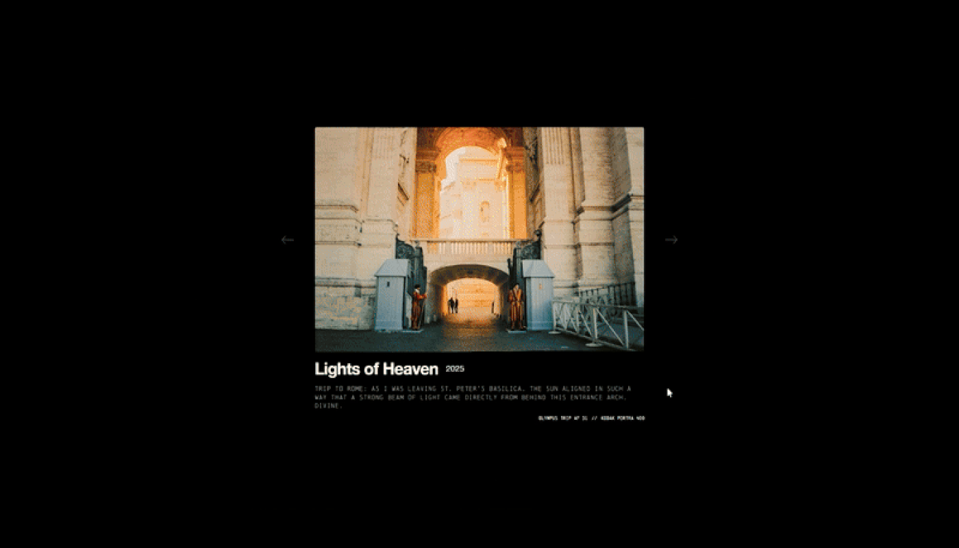 The idea came from the need to find a more authentic space to share my work. Instagram no longer felt suitable for this purpose, as photography is no longer the platform’s main focus. So I decided to create my own page, not just as a showcase, but as an interactive experience inspired by analog photography.